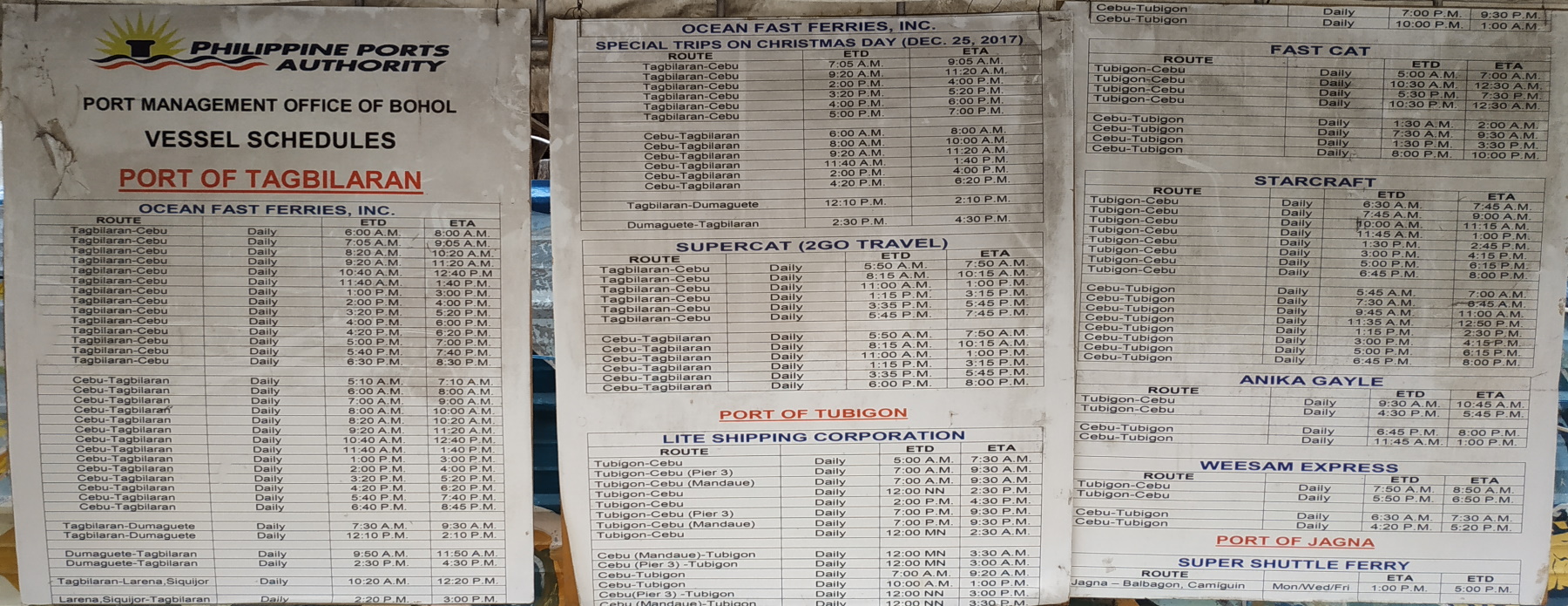 Siquijor, sale a las 10:20 y tarda aproximadamente 1h30. Cuesta 700 PHP, mas 20 PHP de tasas portuarias. Cualquier agencia de viajes de Alona Beach, vende billetes con antelación por una módica comisión de 50 PHP.