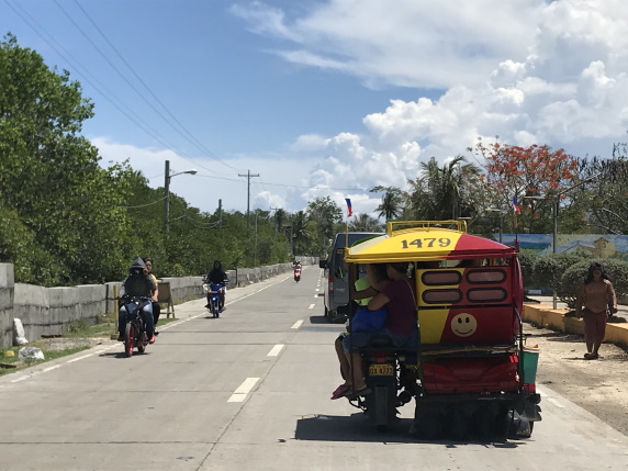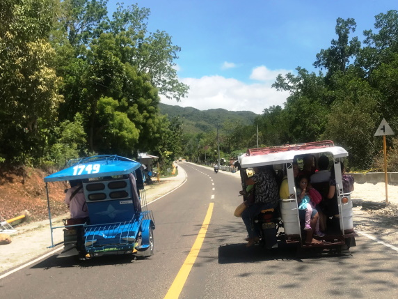 Cambiamos de isla. Para ir desde Alona Beach hasta el puerto de Tagbilaran, existen básicamente tres opciones: autobús público, furgoneta privada o un triciclo. Tras preguntar en varios sitios, no sacamos nada en claro sobre los horarios y puntos de parada del autobús, así que lo descartamos. Las furgonetas privadas suelen ofrecerlas los hoteles y agencias de viaje, cuestan entre 500 y 800 PHP por persona. El triciclo es el modo más económico de llegar, cuesta 300 PHP, y tarda unos 45 minutos.