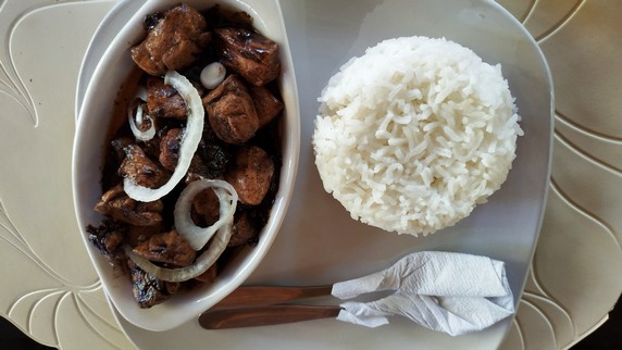 chicken adobo (pollo marinado en salsa de soja y especias, frito en sarten y guisado hasta que está tierno) y