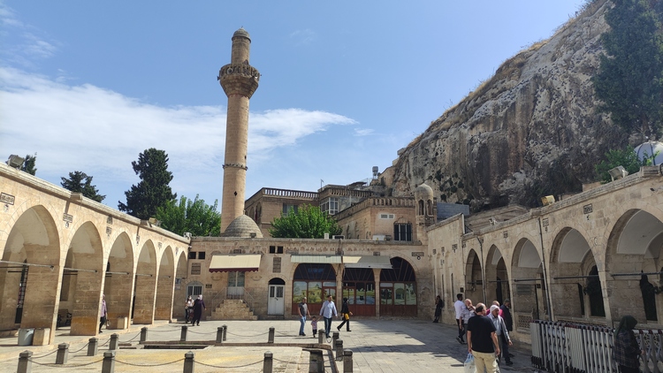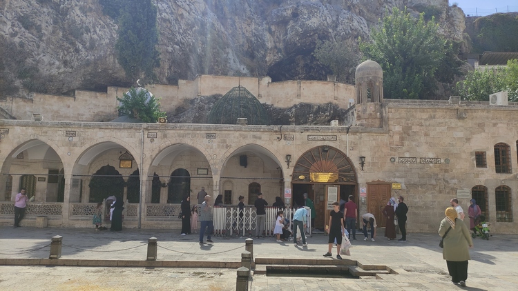 Una noche el rey Nemrut tuvo un sueño, "este año nacerá un niño y destruirá tu reino y tu religión pagana". Nemrut ordenó matar a todos los niños nacidos durante el siguiente año. Sara, preñada del profeta Abraham, se ve obligada a dar a luz en secreto en una cueva, donde deja al niño y vuelve a casa. El niño creció allí alimentado durante siete años por una gacela. La cueva de Abraham se encuentra en el interior de una mezquita, al oeste del bazar, donde las mujeres echan monedas en el pozo que hay dentro de la cueva con la esperanza de quedarse embarazadas. El ambiente es reverencial, Abraham es un profeta muy importante en el islam, es el primer musulmán, el primer monoteísta en un mundo perdido en el paganismo.