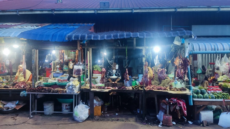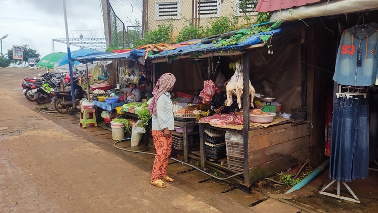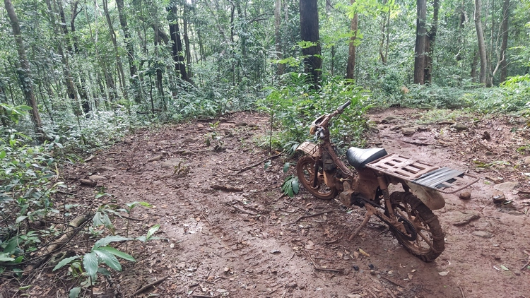 Llenamos depósito de LPG antes de salir de Banlung, 15.000 khr. Paramos a comer en Kaoh Nheaek, un pueblo de unos 3.000 habitantes, el más grande entre Banlung y Sen Monorom, convenientemente ubicado a mitad de camino. Tiene forma de T, debido a que se encuentra en un cruce de carreteras. Hay un par o tres de gasolineras, pero ninguna de ellas sirve LPG. Preguntamos a un conductor de tuktuk local, que nos acerca hasta un taller mecánico, donde rellenan el tanque de nuestro tuktuk con el gas que sale de una bombona colocada sobre una báscula. Cobra por kilos. Hay unos pocos restaurantes con el comedor completamente abierto a la carretera principal, nos paramos en el que tiene más ollas a la vista. Comemos pollo con jengibre y verduras, caldo de cerdo con bambú y huevo, arroz blanco de acompañamiento y dos aguas, 16.000 khr