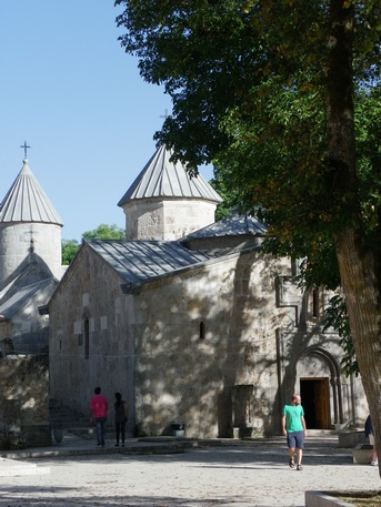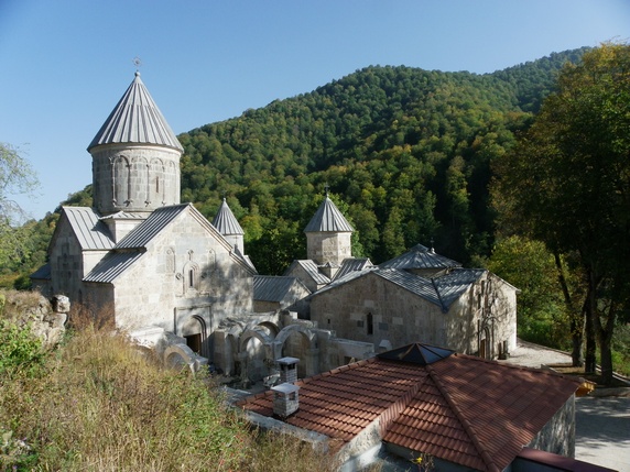 Haghartsin. Fue fundado entre los siglos X y XI, y ampliado en epocas posteriores. Permaneció activo hasta la época soviética en la que fue desalojado, y ahora tras la independencia vuelve a ser un espacio abierto al culto. Integrado en el paisaje, sin murallas que lo portejan, quedan en pie las iglesias de San Gregorio (1184), San Esteban (1244) y la mas grande e importante Iglesia Madre de Dios (1281). Pero su edificio de mayor interés es el enorme refectorio (1248) cuyo alto techo surcan amplios y majestuosos arcos de piedra entrelazados que lo cruzan de lado a lado. No faltan algunos bellos