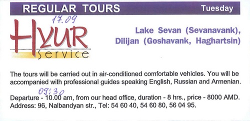 Otra excursión típica de un día desde Yerevan es el lago Sevan y los alrededores de Dilijan. Situado a 1.950 mts de altitud, es un enorme lago de alta montaña que ocupa el 5% del país. Tiene además una gran importancia histórica, al tratarse del único de los tres grandes lagos (junto a Van y Urmía) del Reino Armenio que se encuentra en la actual República Armenia.