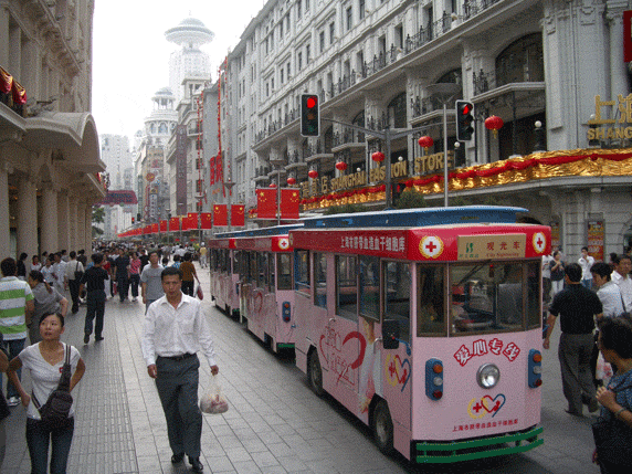 Nanjing Road (南京路) De cinco km de largo, es la calle central y más activa de Shanghai, y la calle comercial más importante de China. Es una zona ideal para compras y comida, numerosas marcas internacionales se encuentran aquí: KFC, McDonalds, Tiffany, Geox, Mont Blanc, Dunhill, Warner Bross... Aunque la zona más emblemática es la parte peatonal próxima al Bund, donde junto a pequeñas tiendas tradicionales conviven modernos centros comerciales, marcas internacionales, teatros, hoteles, restaurantes y mucho neón. Un tren guiado por ruedas permite recorrer cómodamente toda la zona por 5 yuans.