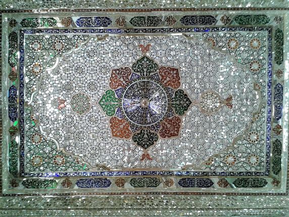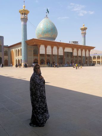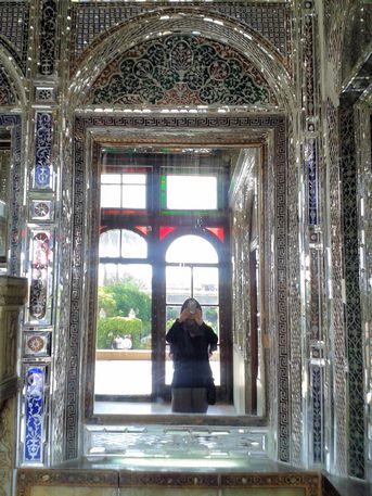 Aramgah e shah cheragh, mausoleo de Sayyed Mir Ahmad, uno de los 17 hermanos del Imam Reza, asesinado por el Califato en 835 en este lugar. Acceso gratuito. Chador obligatorio. Un enorme patio rodea el santuario, fácilmente reconocible por la gran cúpula azul levantada sobre la tumba, flanqueada por dos altos minaretes. El patio es un lugar de encuentro, la gente ocupa cualquier sombra para leer, descansar, hablar con los amigos, o simplemente pasar el rato. Entramos en la mezquita que alberga la tumba, en una brillante sala, con estancias separadas para hombres y mujeres, que la rodean y abrazan mientras rezan efusivamente.
