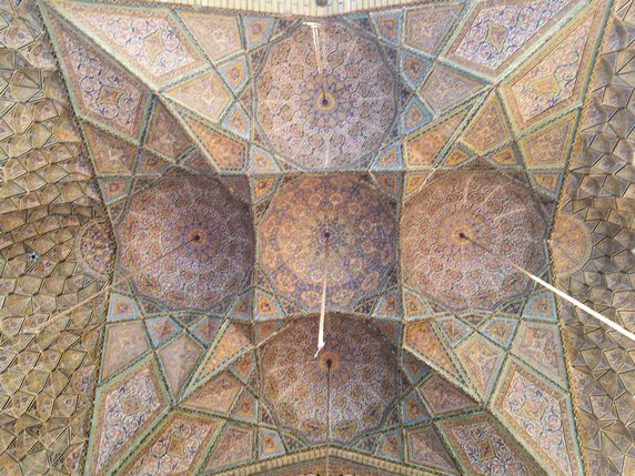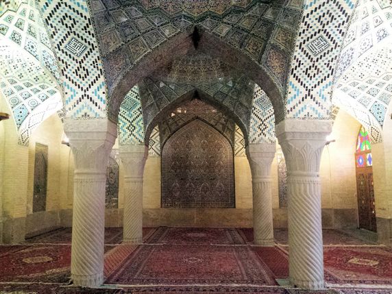 iwans y altos minaretes baldosados le confieren la belleza clásica de las mezquitas iraníes. Lo más destacado en esta, es una sala hipóstila con coloridas vidrieras al patio, que capturan la luz creando bellas estampaciones en el suelo.