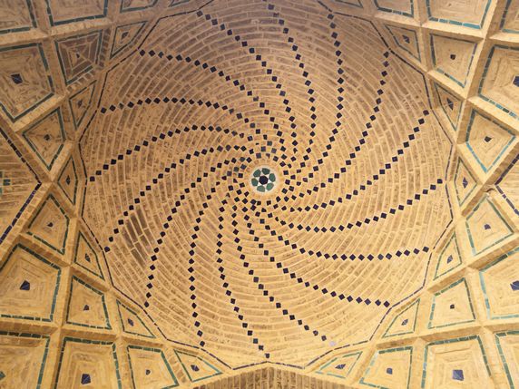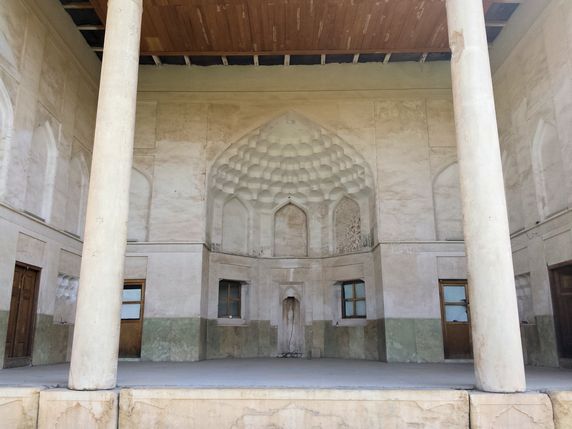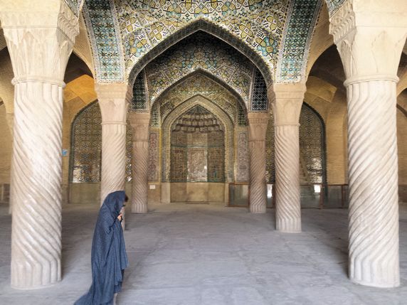 iwans, en vez de los cuatro típicos de las mezquitas iraníes. Tras uno de ellos se encuentra una sala de oración con 48 columnas, y un maravilloso