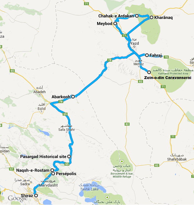 Morteza, un conductor que recomienda Lonely Planet, para realizar el trayecto desde Shiraz a Yazd, parando en los puntos de interés, por 130$. Los cuatro consultados por correo estaban entre 130$ y 150$. Después pactamos dos días más para visitar los alrededores de Yazd por 130$ mas, las agencias consultadas por correo en Yazd nos ofrecían una media de 80$ diarios. Nos pareció mas cómodo hacerlo todo con uno.