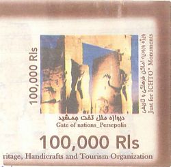 50.000 IRR, 1,25€), son tres inscripciones y bajorrelieves en piedra caliza que datan de la época Sasanida, siglo III dc. Las escenas representan a Shapur I a caballo seguido por nueve nobles a pie; la investidura de Ardashir I, que recibe la corona de un sumo sacerdote; y una última con Ahura Mazda y Shapur I de nuevo.