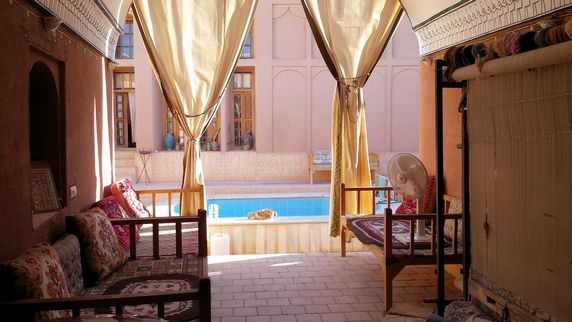 Farvardinn Desert Inn, en Fahraj, (1.500.000 IRR, 37,5€). Otra casa tradicional rehabilitada y muy bien decorada, con un agradable y tranquilo patio, llevada por una pareja muy agradable. Habitación doble, con baño y ducha, aire acondicionado natural. Dos camas dobles, mantas, y espacio suficiente para estar a gusto. Wifi y desayuno incluido.