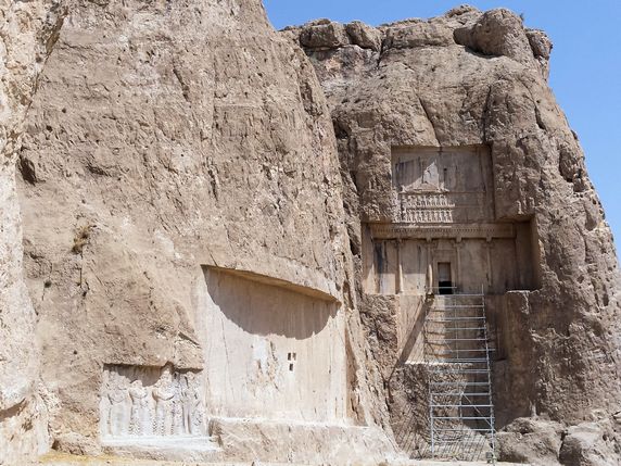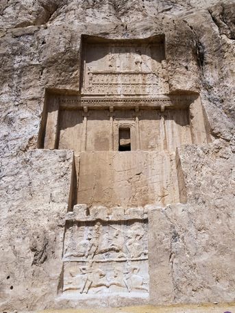 100.000 IRR, 2,50€), una necrópolis aqueménide que contiene cinco enormes y espectaculares tumbas cruciformes excavadas en la roca de una montaña. Bajo ellas, unas inscripciones nos informan sobre sus reales huéspedes: de izquierda a derecha son Darío II (423 – 404 aC), Artajerjes I (465 – 424 aC), Darío I el Grande (522 – 486 aC), la tumba inacabada de Darío III (336 – 330 aC), y por ultimo Jerjes I (486 – 465 aC). Frente a ellas hay una Torre del fuego zoroástrica, y en un extremo, media docena de bajorrelieves del periodo sasánida y elamita, esta última de 1100 – 1000 aC.