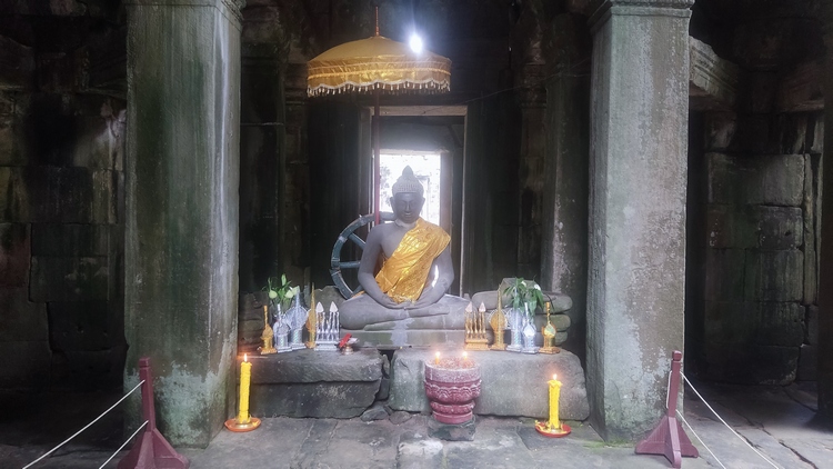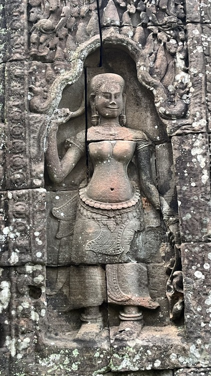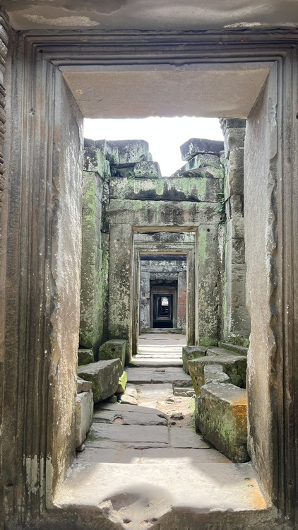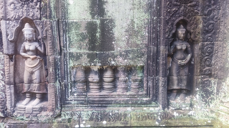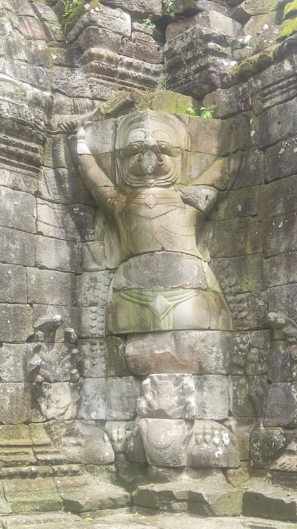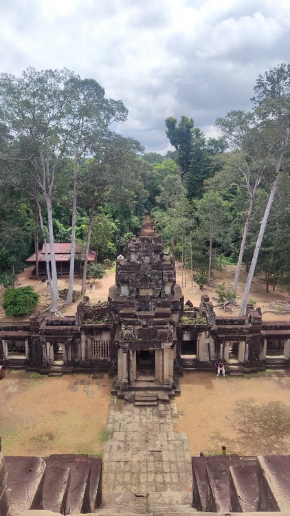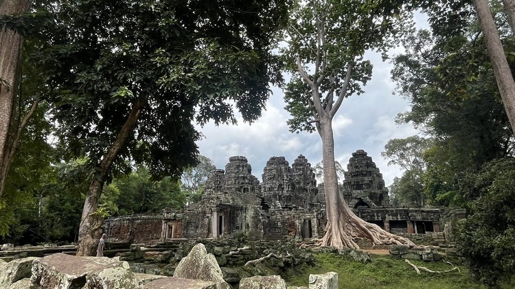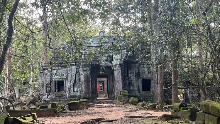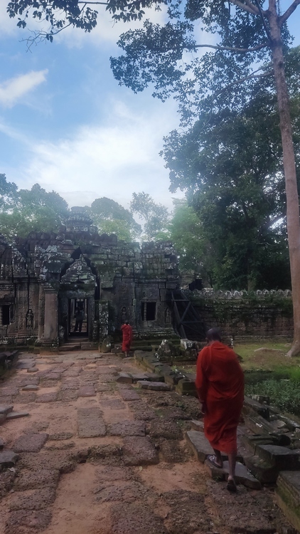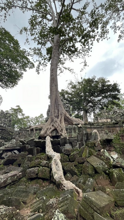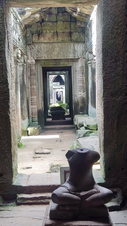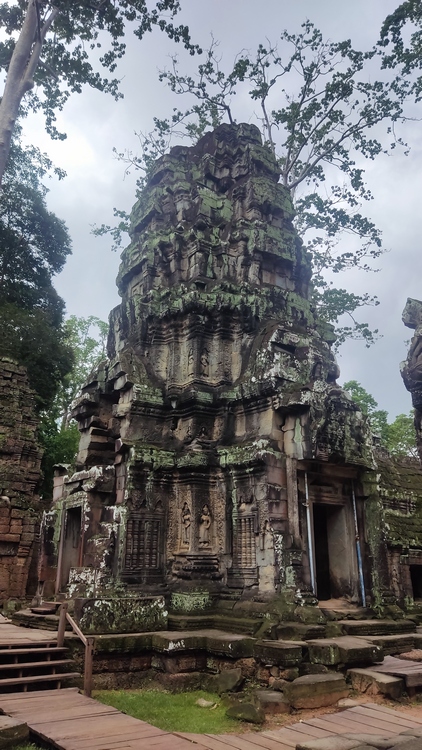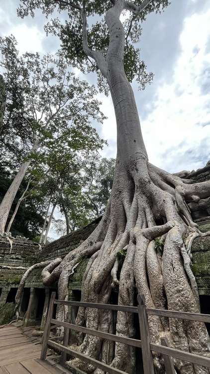 Uno de los templos más conocidos y fotogénicos es Ta Prohm. La selva engulle el monumento, arboles gigantescos atraviesan sus estructuras y cientos de metros de raíces abrazan las piedras, aunque está limpio de hierbas y los caminos que lo atraviesan son cómodos y seguros. A pesar de ello algunos pasillos están bloqueados por grandes bloques de piedra caídas cubiertas de liquen y musgo. Por lo demás, torres de flor de loto, pasillos, arcadas y bajorrelieves, como en todos los demás.