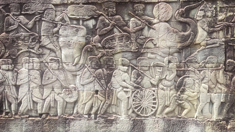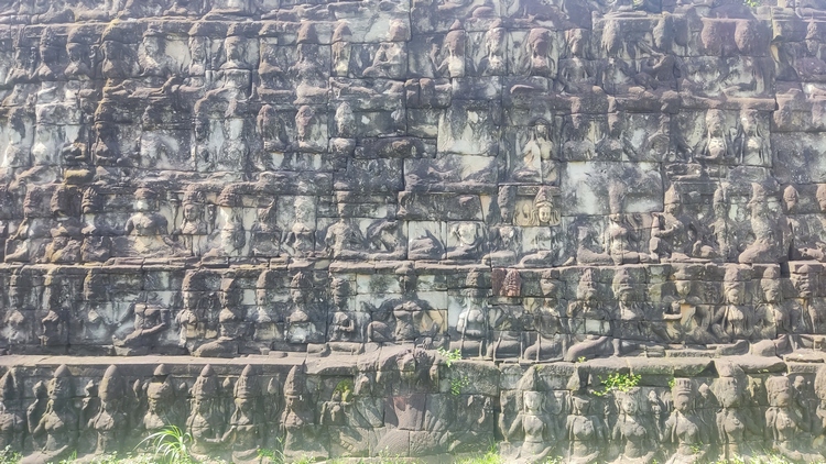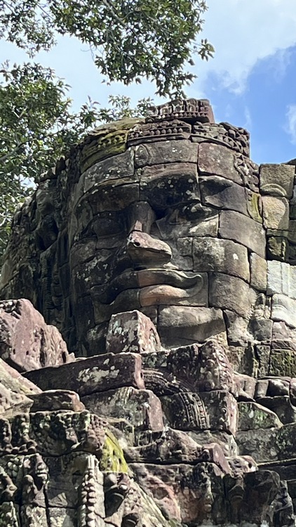 El único templo que puede rivalizar con Angkor Wat, en cuanto a tamaño, esplendor y belleza es Angkor Thom, realmente una ciudad amurallada rodeada por un muro de 13 km de longitud y 8 mts de altura. Dentro del recinto hay varios monumentos, entre los que destacan el templo de Baphuon, otra representación del monte Meru; la estatua y terraza del rey leproso, cuyos extensos muros están tallados con bailarinas, guerreros y escenas mitológicas; Phimeanakas, el antiguo palacio real; la terraza de los elefantes, que originariamente media 350 mts de largo; y el templo de Bayon, famoso por sus 54 torres decoradas cada una con cuatro caras que sonríen en todas direcciones, además de la gran variedad de bajorrelieves bien conservados.