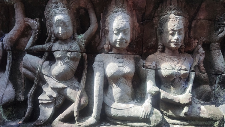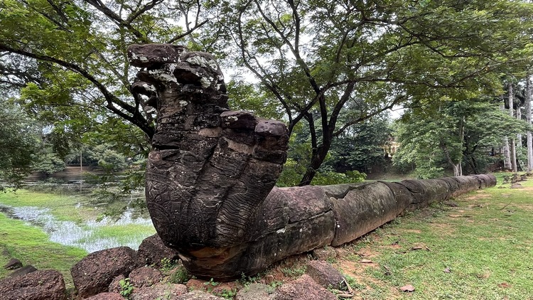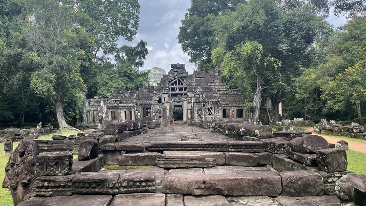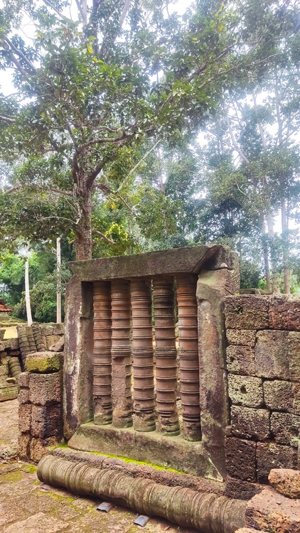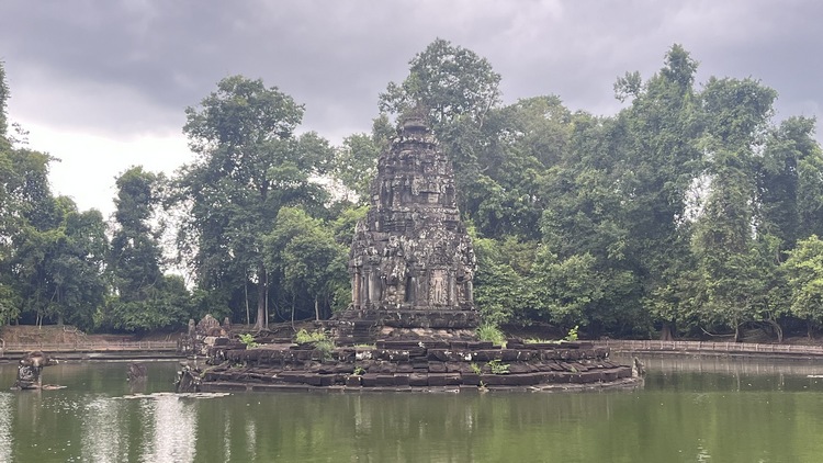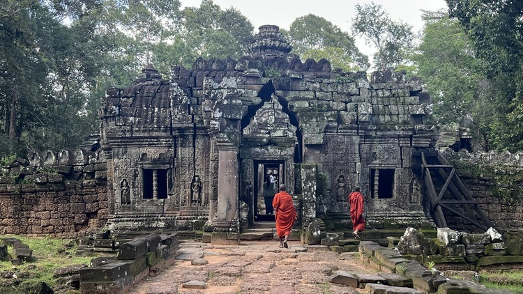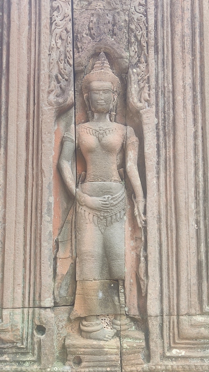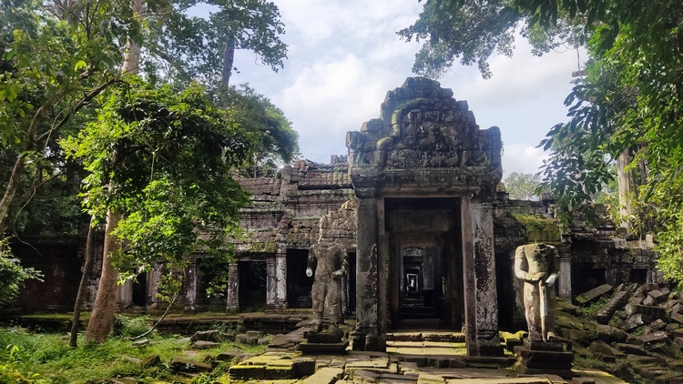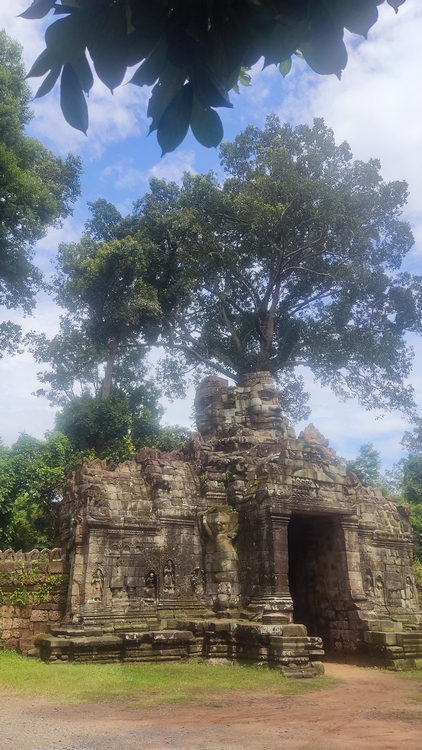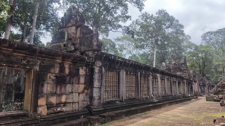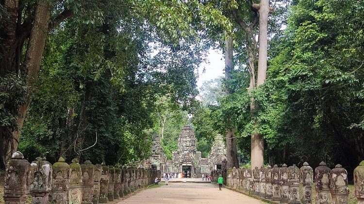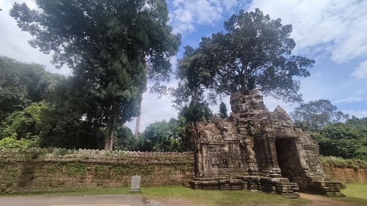 En medio de un recinto rodeado de cuatro muros se levanta el templo Banteay Kdei, mitad en ruinas mitad en restauración, comido por los líquenes y algunos árboles, que le dan un aspecto muy interesante. Llaman la atención sus puertas de acceso decoradas con garudas y coronadas por los mismos cuatro rostros que encontraremos en el templo de Bayon en Angkor Thom. Un pasillo empedrado nos lleva de una galería a otra, adornadas con relieves de seres femeninos y bailarinas mitológicas. Frente al templo se encuentra Srah Srang, un lago artificial construido en el siglo X.