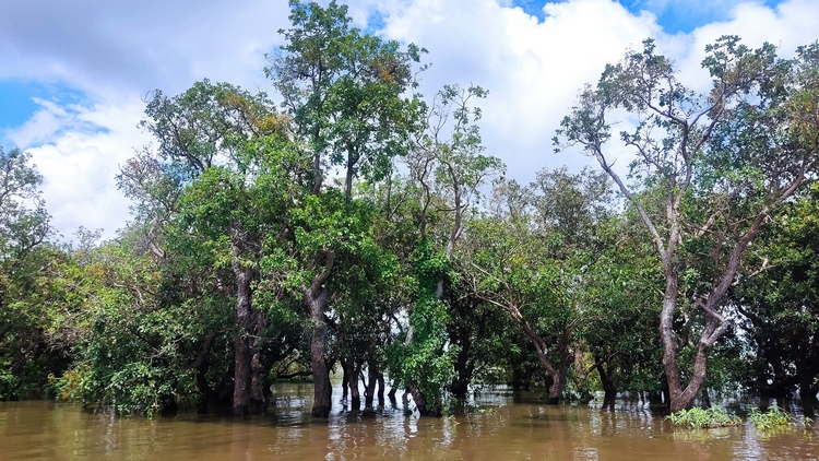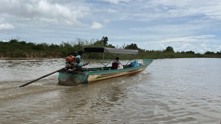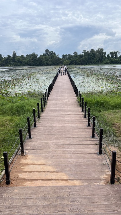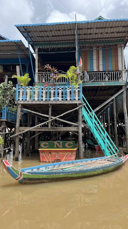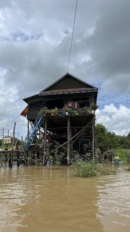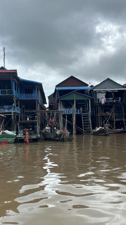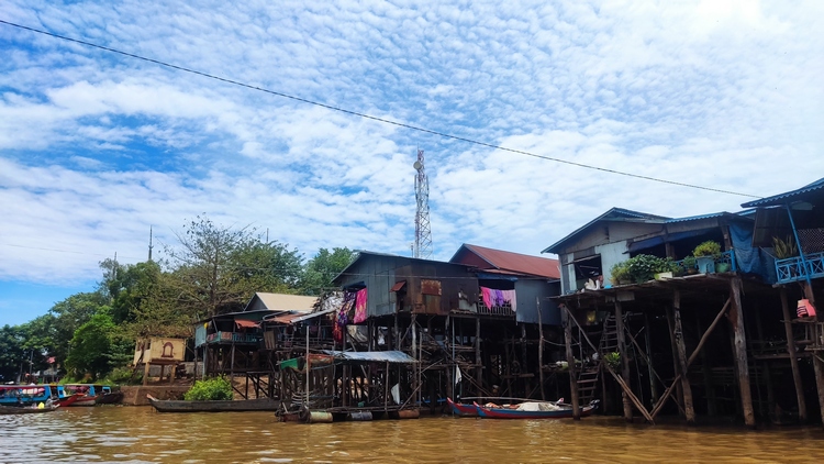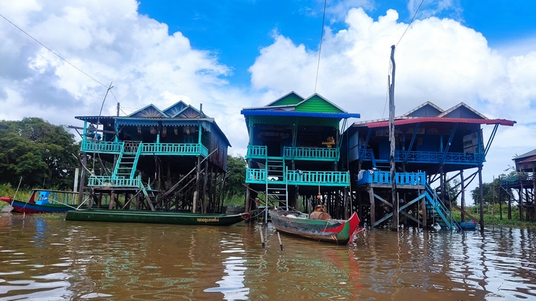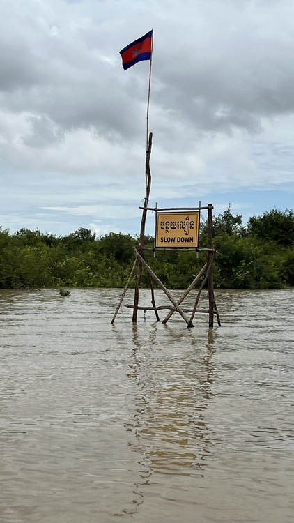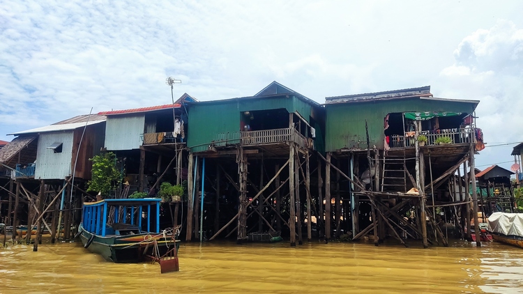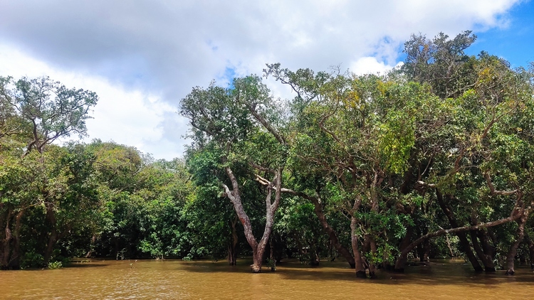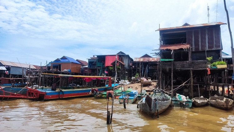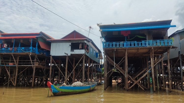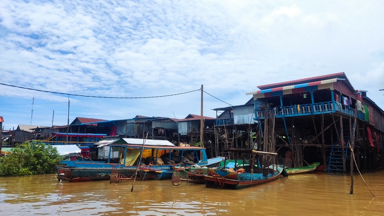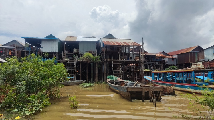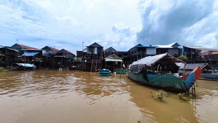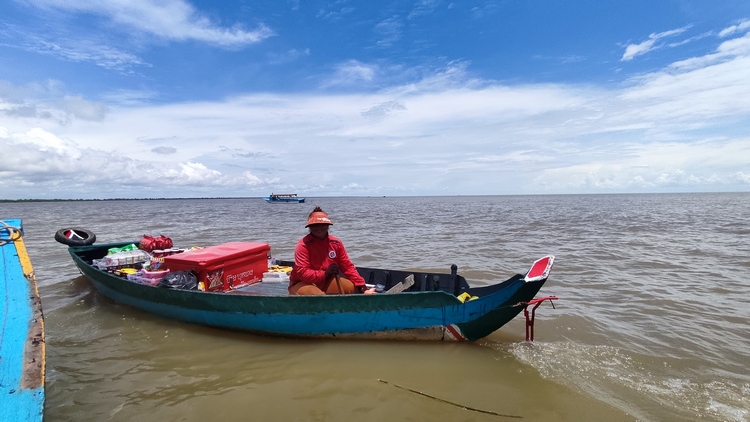 Otra de las atracciones de los alrededores de Siem Reap, son los pueblos flotantes del lago Tonlé Sap, pueblos eminentemente pesqueros que amenazados por la sobrepesca y el cambio climático, dependen cada vez más del turismo. Nosotros visitamos Kompong Pluk, uno de los más accesibles, al menos en nuestro tuktuk. Aproximadamente un par de kilómetros antes de llegar a la zona inundada, hay una oficina restaurante donde se venden los tickets de acceso (20$). La carretera sigue unos doscientos metros más antes de desaparecer sumergida en el lago a la altura del muelle. El ticket que has comprado te da derecho a subir en una pequeña barca a motor, que atravesando el pueblo y un pequeño bosque colindante, llega hasta la zona abierta del lago. Aquí descansa unos minutos. Las tranquilas aguas se pierden en el horizonte, no nos cruzamos con ningún turista, solo pescadores y una barca tienda que se acerca a vender tentempiés o refrescos. Tiempo total en la barca ronda la hora.