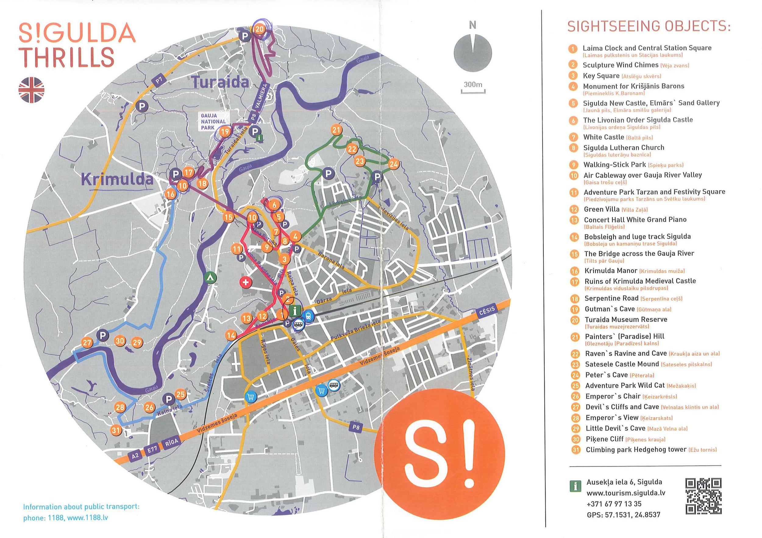 plano con las diferentes rutas a seguir. Sigo una variada ruta lineal que incluye tres castillos, iglesias, una cueva y el cruce en teleférico del río Gauja.