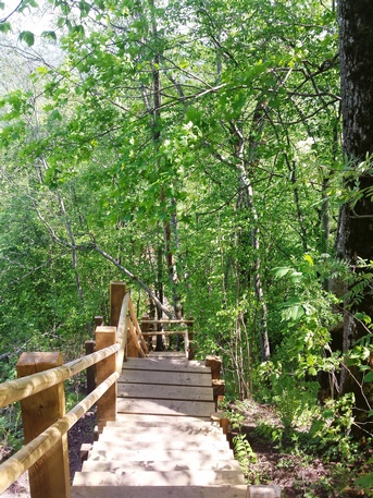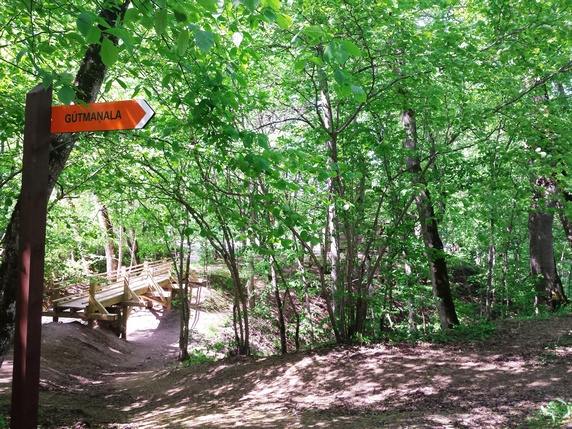 Poco antes de llegar se ve a mano izquierda, en la ladera de la montaña, Krimulda Manor, la residencia del príncipe Livens construida en 1848. Al salir del teleférico seguir el camino frente a la estación que se adentra en un bosque a mano derecha, donde se ven las ruinas del castillo medieval de Krimulda, construido en 1312 por el arzobispo de Riga. Ahora hay que seguir los letreros que indican Gulmanasin. Tras diez minutos andando por el bosque se llega a una larga escalera de madera que baja hasta el valle. Una vez abajo seguir el camino que queda a mano derecha, entre el bosque y un estanque de nenúfares y cisnes.