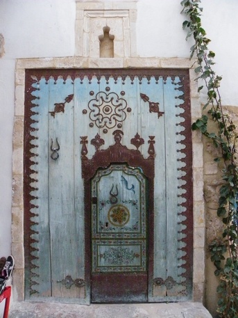Hotel Emira, 30 TND con desayuno. En el interior de la medina, a 30 mts de Bab el-Jedid. Habitación doble embaldosada con azulejos azul brillante, baño con agua caliente, armario, calefactor y terraza sin vistas.