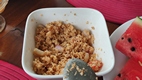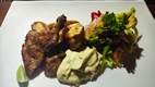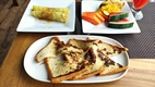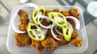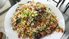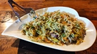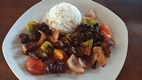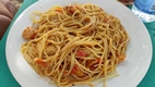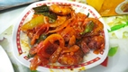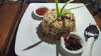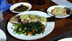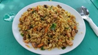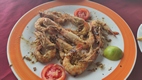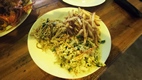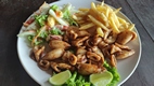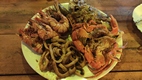Gambas, calamares, cangrejo y snnaper, con arroz, noodles y patatas fritas |