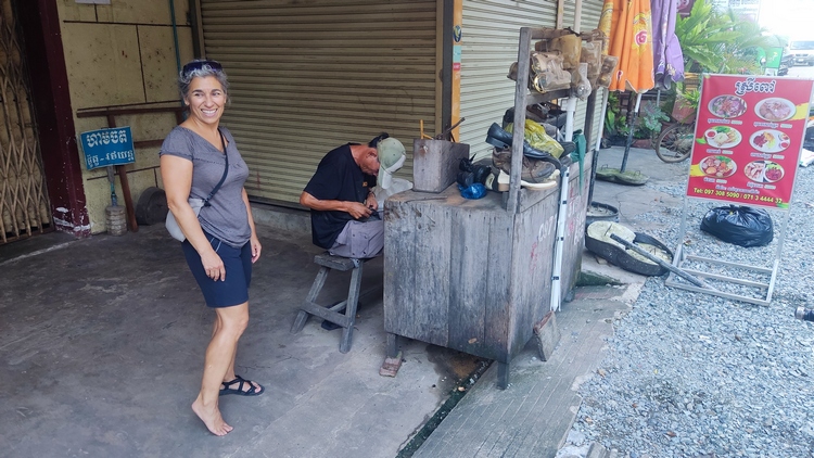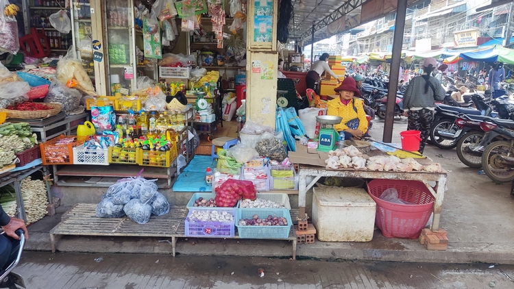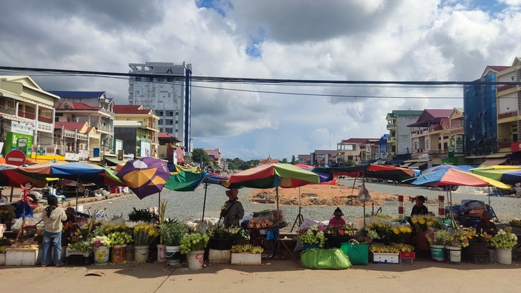 Paralelo al Mekong, a dos calles del centro, discurre un agradable paseo donde vende fruta y pipas de flor de loto, y se instalan barbacoas al atardecer. Hay un animado mercado en el centro que cubre casi todas las necesidades locales, secciones de ropa, calzado, material escolar, ferretería, pequeños electrodomésticos... de todo, incluso un zapatero remendón que nos sacó de un aprieto. Pero turísticamente hablando, la ciudad estaba bastante muerta, tal vez porque era temporada de lluvias. Viendo que poco íbamos a hacer allí, tan solo pasamos una noche, para seguir ruta hasta Banlung al día siguiente.