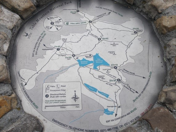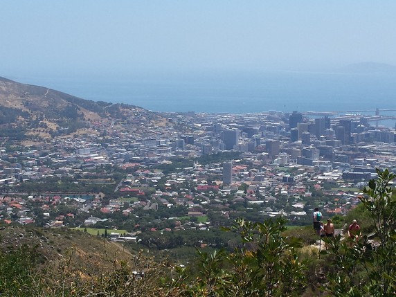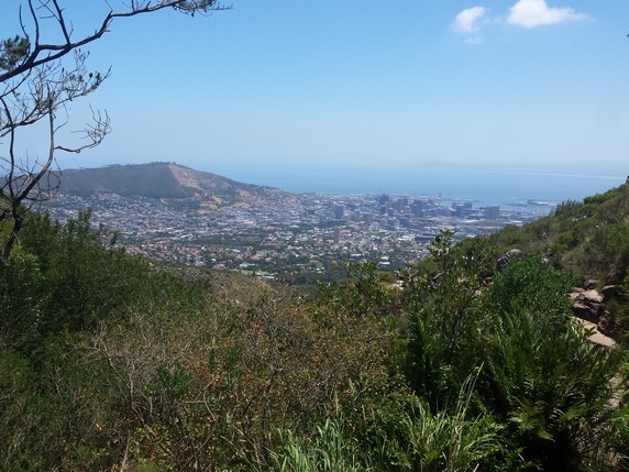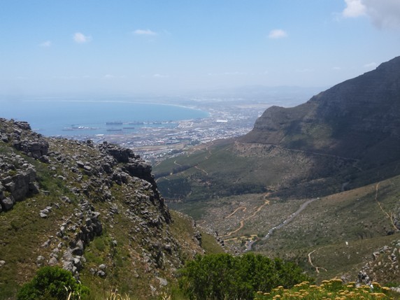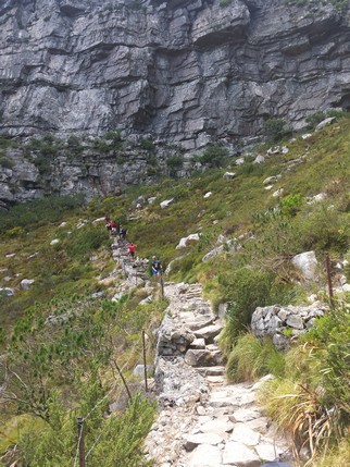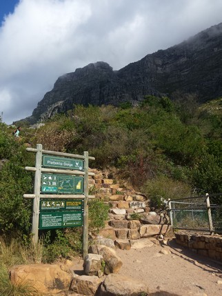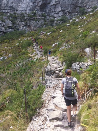 Platteklip Gorge, un sendero con un desnivel de 1.000 metros (500 – 1500 mts) que se tarda unas 2h30 en hacer. Es un camino rocoso, escalonado, y en ocasiones resbaladizo, muy empinado y totalmente expuesto. Apenas hay sombras, y en las pocas que encontramos no caben más de dos personas bajo ellas. Pero no por ello deja de ser reconfortante, y las vistas espectaculares durante todo el recorrido. Al llegar a la cima hay diez minutos de terreno llano hasta la estación del teleférico, y unas vistas increíbles de la ciudad, las playas de Clifton y Camps Bay, y la parte sur de la Península del Cabo.