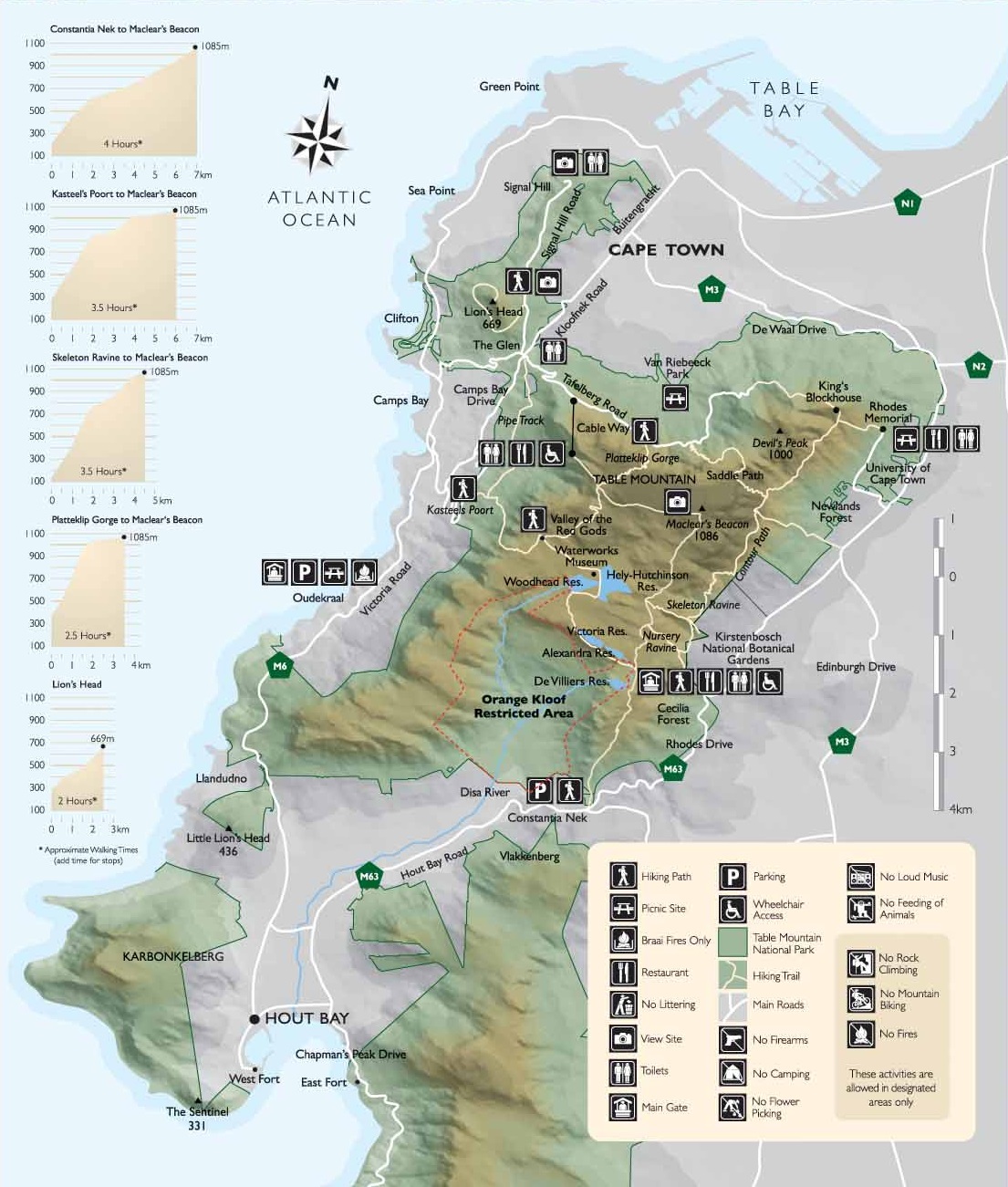 fynbos, un tipo de matorral particular de la península. Sobre todo alrededor de la estación del teleférico, es fácil encontrarse al daman del Cabo, un roedor africano que parece un cruce de marmota y conejo de indias, desafortunadamente cualquier animal de mayor tamaño ha sido aniquilado por el hombre a lo largo de la historia. A pesar de todo es un entorno natural precioso, con fácil acceso desde el centro, razón por la cual las excursiones a la cima es uno de los atractivos típicos de la ciudad.