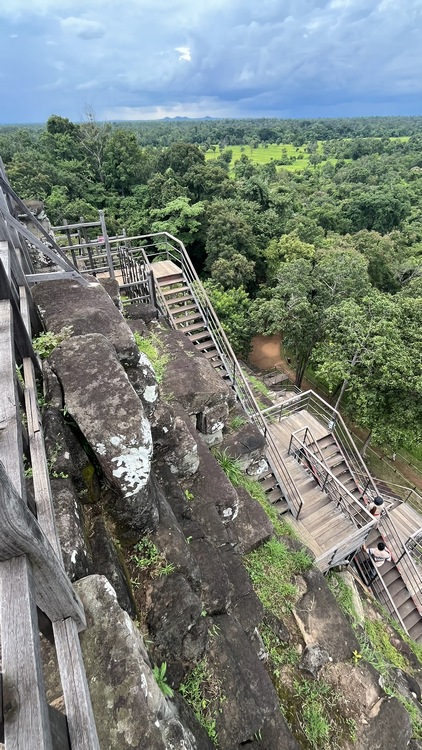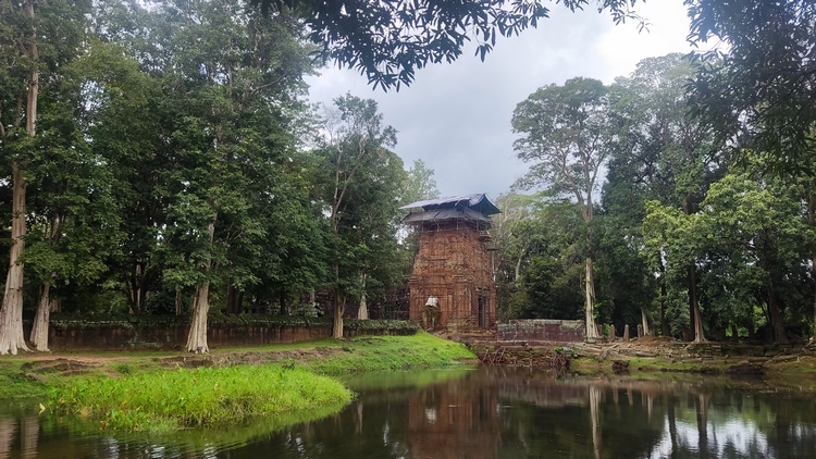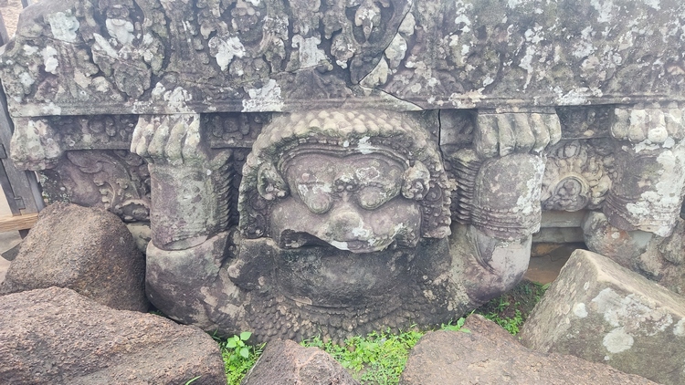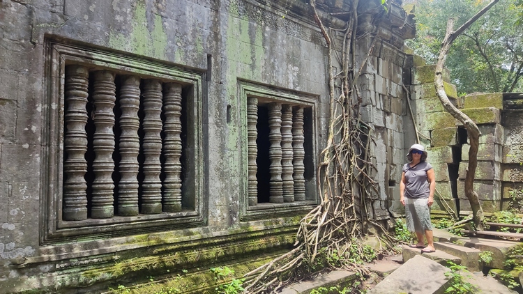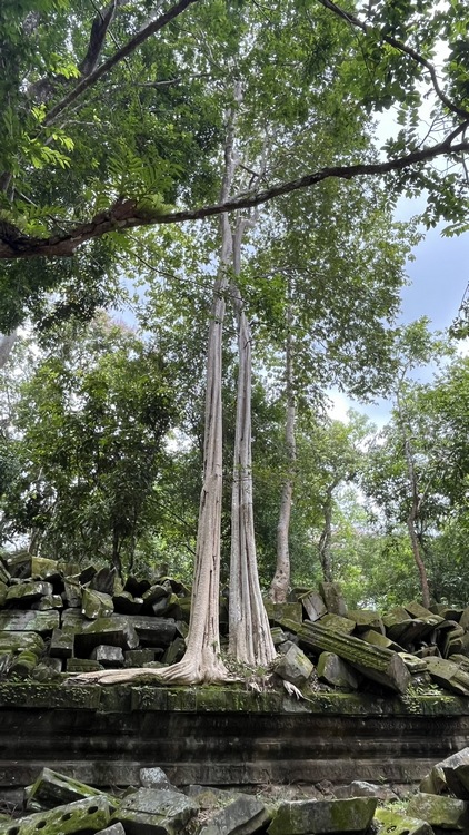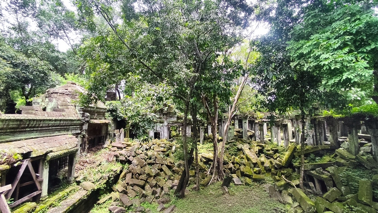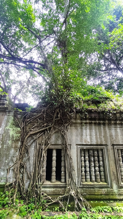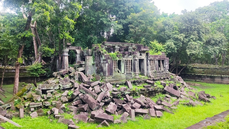 Por el camino paramos en dos templos que son accesibles con el ticket genérico de Angkor, pero ya habíamos pagado los tres días en Siem Reap, así que hubo que pagar entrada por cada uno de ellos. El Templo de Beng Mealea (acceso 10$) se encuentra a 70 km de Siem Reap, está en gran parte sin restaurar, sus muros y torres están llenos de árboles y enredaderas, literalmente devorado por la jungla en algunas zonas. Una pasarela de madera guía a los visitantes entre los restos de la estructura, permitiendo acceder a su interior y viéndolo en algunos tramos desde plataformas elevadas.