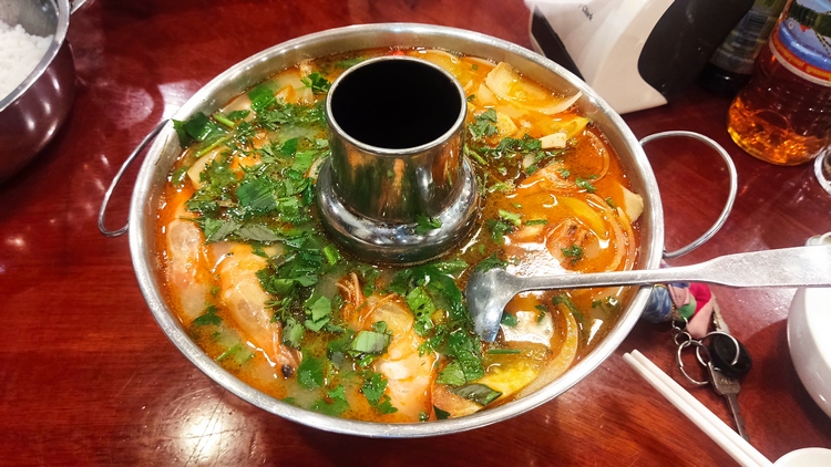 Tom Yum Seafood Soup, Lok Lak Beef, y dos cervezas, 77.000 ker.