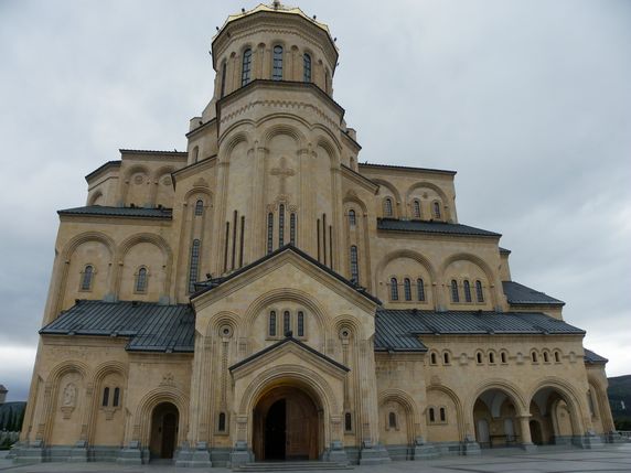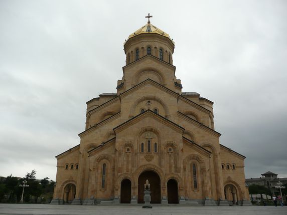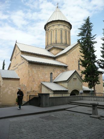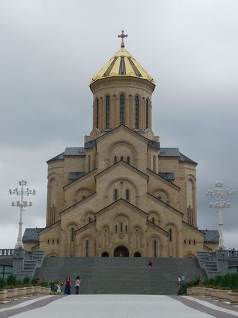 Catedral Tsminda Sameba, un enorme templo de 84 mts de altura construido para conmemorar los 2.000 años del nacimiento de Cristo y los 1.500 años de la creación de la Iglesia Ortodoxa Georgiana. El complejo incluye además un campanario independiente, la residencia del Patriarca, un monasterio, un seminario clerical y academia teológica, y varios talleres. Su interior austero y la falta de fieles cuando lo visitamos, solo aumentaba su aspecto megalomaníaco.