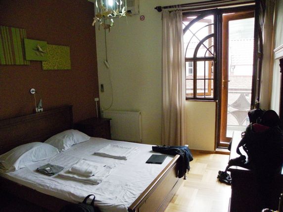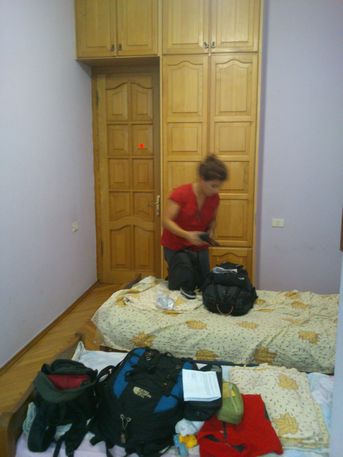 Darchee Hostel. 60 GEL, hab. doble. En la estrecha calle adoquinada que sube desde Rustaveli Modelani. Dividido en dos plantas, abajo hay dos baños, solo uno de ellos tiene ducha, y además funciona fatal, y arriba hay dos habitaciones compartidas para seis y ocho personas, más nuestra pequeña doble con balcón. Dispone de comedor con una mesa, unos sofás y una pequeña cocina. Wifi, café y té gratuitos todo el día. En la escala baja de los hoteles baratos. Evitar.