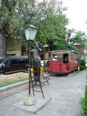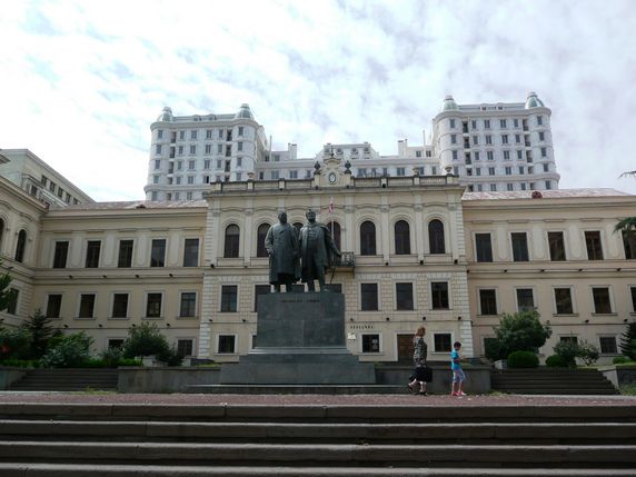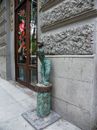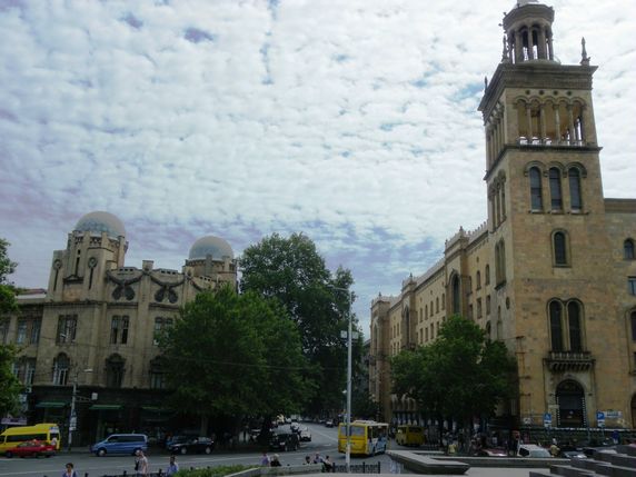 Rustaveli av., una calle de 1,5km de largo donde se situan algunos de los edificios mas emblemáticos de la ciudad. Es una calle con seis carriles de doble sentido y con muchísimo tráfico, muy peligrosa para cruzar a pie, hay que buscar los escasos pasos subterráneos. Las aceras están llenas de pequeñas estatuas, en bronce creo, que parecen personajes de teatro burlesco. El