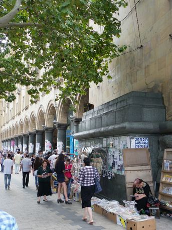 Rustavelis modeni, una plaza con algunos bares y restaurantes dominada por una estatua de Shota Rustavelis, poeta medieval autor de la obra "El caballero en la piel de tigre", el poema épico nacional georgiano. Cruzando dirección sur hay un pequeño mercadillo de souvenirs en la acera. Un poco de todo,