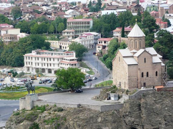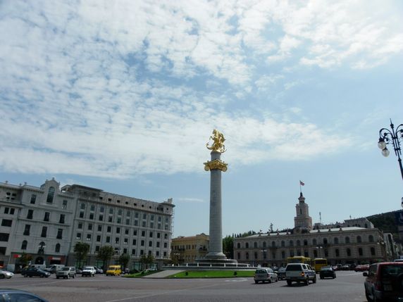 Plaza de la Libertad, donde la estatua del líder comunista ha sido sustituida por una estatua dorada de San Jorge montada sobre un enorme pedestal. Tras la plaza llegamos a los pies de la colina coronada por la fortaleza Narikala. No subimos hasta ella, pero visitamos las iglesias de