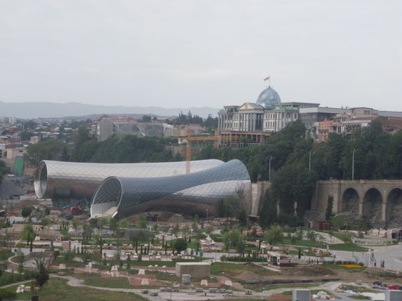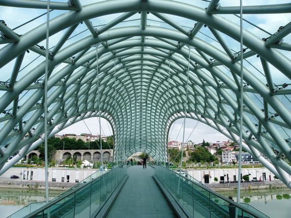 Puente de la Paz, una peculiar estructura peatonal contemporanea de 150 mts que atraviesa el río Mtkvari. Fue diseñado por Massimiliano Fuksas y creó una fuerte polémica en la ciudad por su excesivo modernismo y elevado precio. A nosotros nos recuerda a un nudibranquio, y nos encanta.