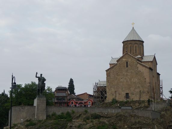 Iglesia Metekhi y la estatua ecuestre del rey Vakhtang Gorgasali en una pequeña colina sobre el río Mtkvari. A mano izquierda queda el Parque de Rike donde desde junio de 2012 un