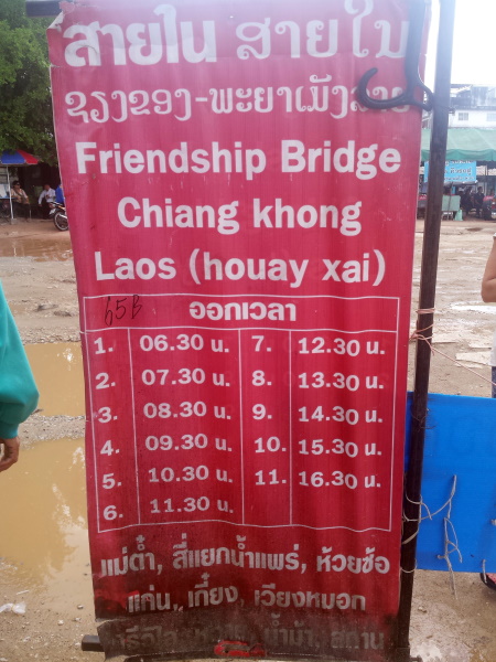 06:00 Bus de Chiang Rai a Huay Xai, 65 bahts cada uno. Hace una parada en un mercado para entregar mercancía, y un par más no recuerdo para que, tres en total. También para a recoger y dejar gente una docena de veces. El autobús es un poco incómodo, pero conseguimos dormir. 08:15 Bajamos en un cruce de carreteras, a 4km de Chiang Khong y a 5km de la frontera con Laos. Aquí hay esperando media docena de tuktuks. Las tarifas son fijas para ir a la frontera: 60 bahts una persona, 50 bahts cada uno si van dos. En un tuk-tuk caben fácil cuatro, así que no es caro. 08:20 Puesto de inmigración tailandés. Revisión de pasaporte, rellenamos el documento de salida y compramos el billete de bus que nos llevará hasta inmigración, en el otro lado de la frontera, 20 bahts. 08:45 Sale el bus que nos traslada al lado laosiano. 08:50 Rellenamos los formularios y pagamos los visados de entrada. Cada uno cuesta 350.000 kips o 35 dolares, pero no aceptan euros. Por suerte allí mismo hay un cajero automático, sacamos 1.500.000 kips.