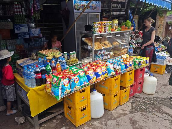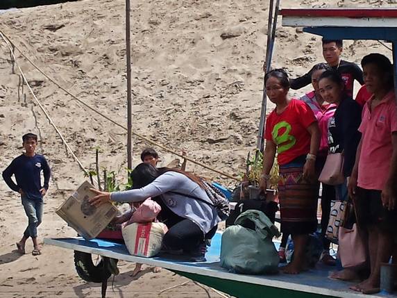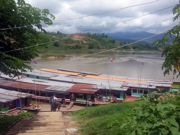 09:15 Ya hemos acabado y podemos irnos a Huay Xai, y aquí no sé porque cometemos el error del día. Se nos acerca una mujer que nos ofrece transporte a la ciudad y el billete del slow boat por 300.000 kips, después de pensarlo un poco aceptamos. En teoría el billete cuesta 240.000 kips y el tuktuk entre 50 y 100 así que asumimos una pérdida de unos 5€ cada uno por ir más cómodos. Craso error. Esperamos casi una hora a que llegue todo el mundo, en total 17 personas. De allí vamos a sus oficinas, una casita en las afueras donde hay un mini supermercado y un negocio de venta de bocadillos. Nos avisan que es el último punto de venta antes de subir al barco. Los incautos turistas compran como locos, las latas de cerveza vuelan. No nos lo creemos, salimos a mirar y a un minuto de allí, girando la esquina, hay una tienda donde nos surtimos mucho más barato. Cuando todos van con las bolsas bien llenas de víveres, nos llevan al muelle, donde por supuesto está lleno de tiendas. Aunque básicamente solo ha supuesto pérdida de tiempo, nunca habíamos sufrido una timada de este nivel con la de años que llevamos viajando, en el fondo me alegro, de todo se aprende, una cosa mas para contar en la web.