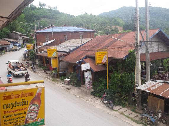 17:30 Llegamos a Pakbeng. El horario de llegada es aproximado ya que la barca funciona como un tuktuk, pasajeros y mercancias suben y bajan por los pueblos y asentamientos que va pasando. Todo ello influirá en la hora de llegada. Pakbeng es un pueblo de una sola calle, que sube colina arriba desde el río Mekong. Aquí solo hay selva y mosquitos, un buen lugar para perderse. Todo él parece dedicado al slow boat y al medio centenar de turistas que llegan cada día. Su única calle es un continuo de hoteles, restaurantes y puestos callejeros que venden todo lo que un turista de bajos ingresos necesita.