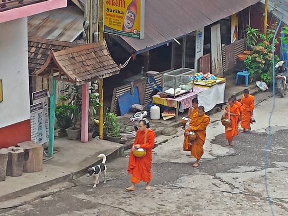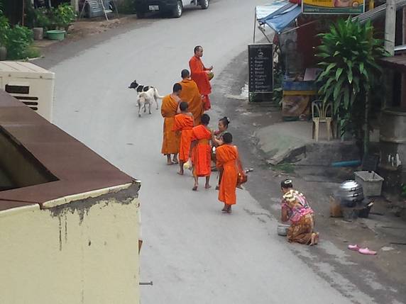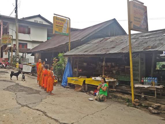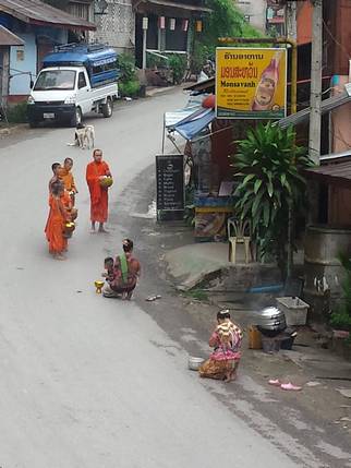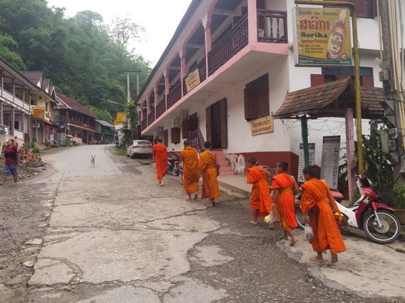 limosna en forma de comida. Es un ritual centenario en el que participan todos los templos del lugar. Los lugareños esperan frente a sus casas a que lleguen los monjes, los cuales llevan un cuenco donde cae una cucharada de arroz glutinoso, no se cruzan ni una sola palabra, ni tan siquiera se miran entre ellos, todo transcurre en la más profunda solemnidad. El devoto tiene preparado suficiente arroz para dar a todos y cada uno de ellos, es muy importante que todos reciban su ración, ya que en teoría va a ser su sustento para todo el día. Esta ceremonia es muy popular en Luang Prabang, pero es en poblaciones diminutas como Pakbeng, donde apenas hay una docena de monjes, donde se puede vivir más de cerca y sin aglomeraciones turísticas.