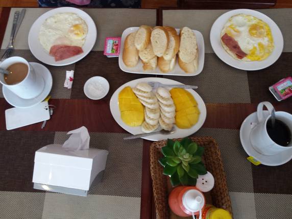 07:30 Desayuno muy completo. Huevos fritos con bacon, pan, mantequilla, mermelada, fruta del tiempo, té o café.