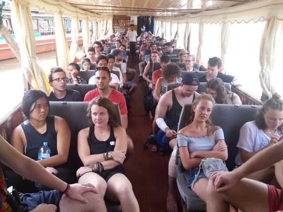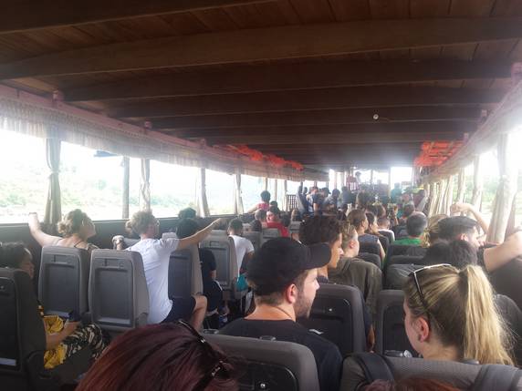 11:30 Sale el slow boat del muelle de Huay Xai. Es una barcaza con capacidad para unas 60 personas, de las que 55 son turistas. Varias agencias con las que habíamos contactado, nos dijeron que una de las ventajas de contratar a través de ellos, en lugar de comprar los billetes directamente en ventanilla, era el poder garantizar el sentarnos juntos. Mentira, los tickets están numerados, los asientos también, pero realmente nadie los respeta. Así que hay que estar lo antes posible en el muelle para abordar la barca, porque cuanto más atrás te sientas, más cerca estas del motor y del bar. Más ruido, más follón, más trasiego de veinteañeros buscando alcohol. Hay un solo lavabo, que teniendo en cuenta la cantidad de gente que hay, se conserva bastante limpio. En el bar no hay más comida que algunas sopas de sobre y patatas fritas, hay que proveerse bien antes de subir.