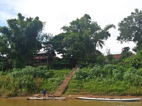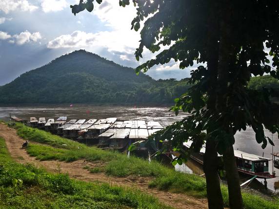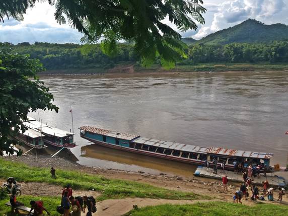 Luang Prabang. La barca amarra en un muelle situado a unos diez kilómetros del centro. Desde allí un tuktuk cuesta 20.000 kips, precio fijo.