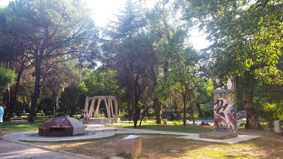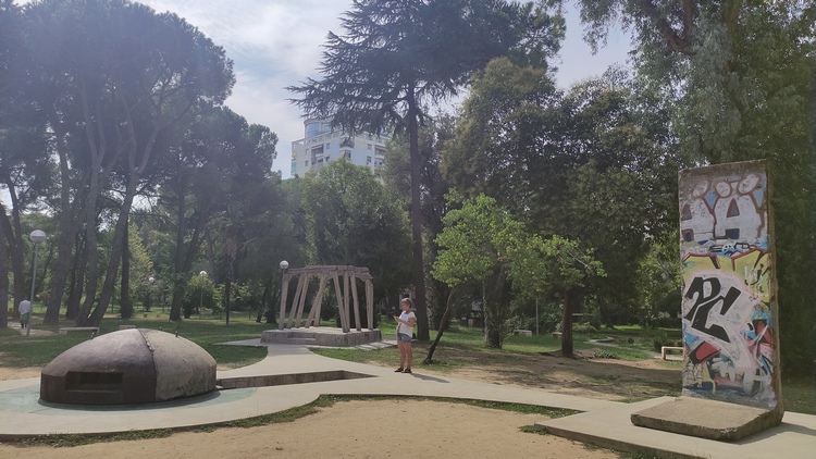 Memorial Checkpoint, donde puede verse un bunker, pilares de la prisión Spac y un fragmento del Muro de Berlín. Tras el parque se encuentra el barrio de