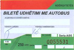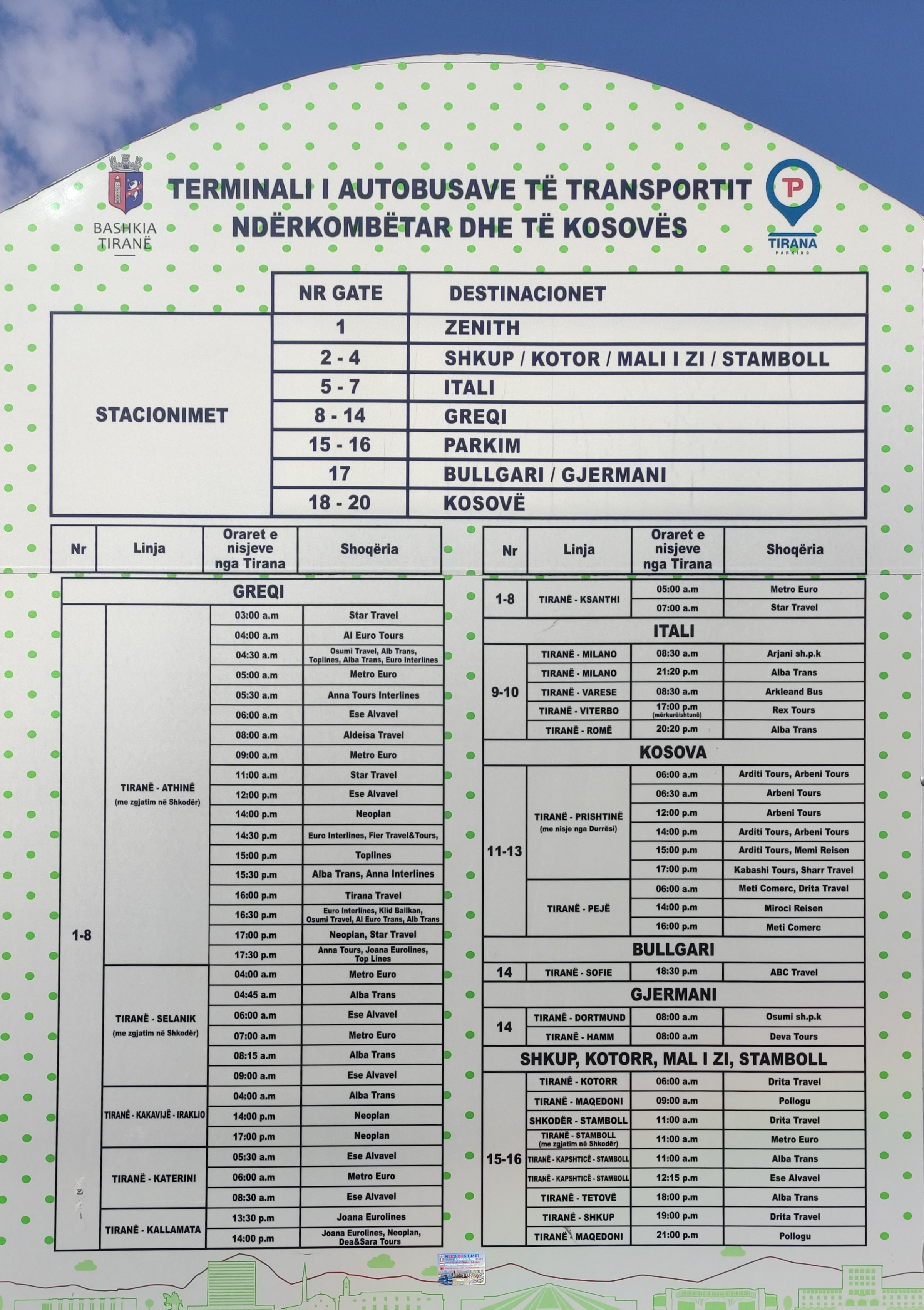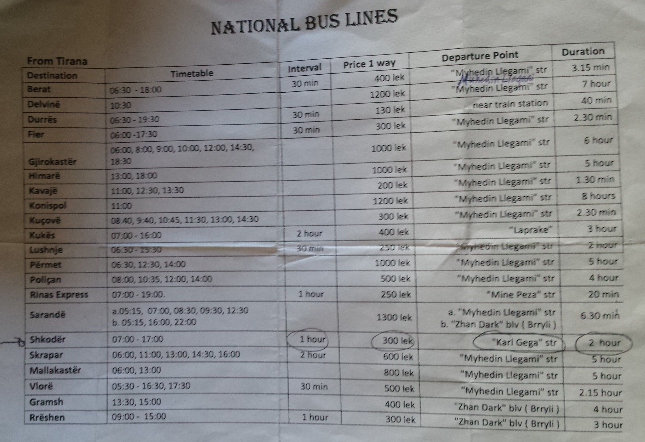 Hay varias estaciones de autobuses y furgonetas de larga distancia en función del destino, preguntar en el hotel. A todas ellas puede llegarse en bus (40 lek) o taxi, suelen estar en las afueras, calcula 30 minutos.
