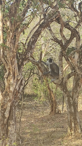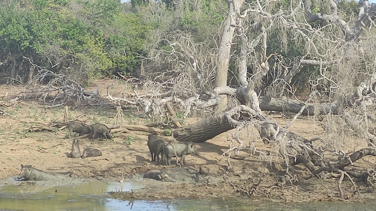 Quien busque comparaciones con África que se olvide, aquí no hay ni por asomo la densidad de animales que hay allí, pero es un safari que difícilmente va a decepcionar a nadie. Durante la primera hora vimos un elefante, un oso y un leopardo, teniendo en cuenta que hay 300, 6 y 25 ejemplares respectivamente, no es un mal comienzo. Durante nuestra visita al parque vimos además facóqueros, antílopes, búfalos, sambas, águilas pescadoras, pelícanos, marabús, kingfisher, mangostas, monos, una cobra erguida en posición de ataque.... El medioidia es el momento de más calor y cuando más difícil es ver animales, aprovechamos para parar un par de horas, darnos un baño en la playa, comer y echarnos una siesta. A última hora salimos en busca de alguna familia de elefantes, tuvimos suerte otra vez, vimos una manada de al menos una docena de miembros con tres pequeños.