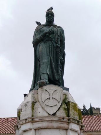 estatua de Gualdim Pais, cruzado y fraile fundador de la ciudad de Tomar; y al otro, la humilde