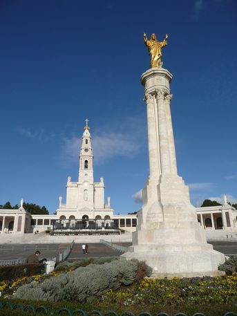 Santuario de la Virgen de Fátima (acceso libre), está situado en la Cova da Iria, antigua propiedad de los padres de Lúcia que fue donada al santuario. Los diferentes puntos de peregrinaje y devoción se distribuyen alrededor de un enorme explanada de un kilometro de largo, en cuyo centro se alza una columna coronada por una imagen en bronce del Sagrado Corazón de Jesús. Al acceder a ella tres devotos la están atravesando de rodillas, hay un continuo ir y venir de peregrinos, rezos y ofrendas. Desde la