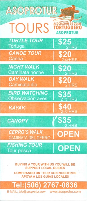Asociación de Guías de Tortuguero. Junto al muelle. Aunque ofrecen los mismos tours y al mismo precio que en el hotel, nos pareció que de esta manera contribuimos sin intermediarios al desarrollo de la comunidad. Las opciones son: avistamiento nocturno de tortugas poniendo huevos en la playa, travesía por los canales del parque natural en canoa o kayak, caminata por el parque natural nocturna o diurna, tirolinas, ascensión al cerro y tour de pesca. Cobro en metálico.
