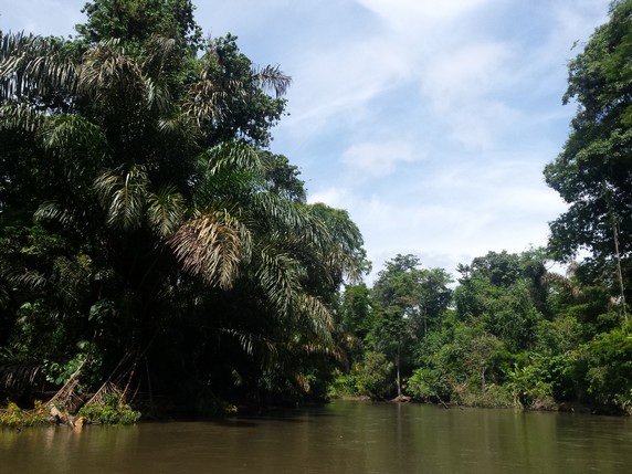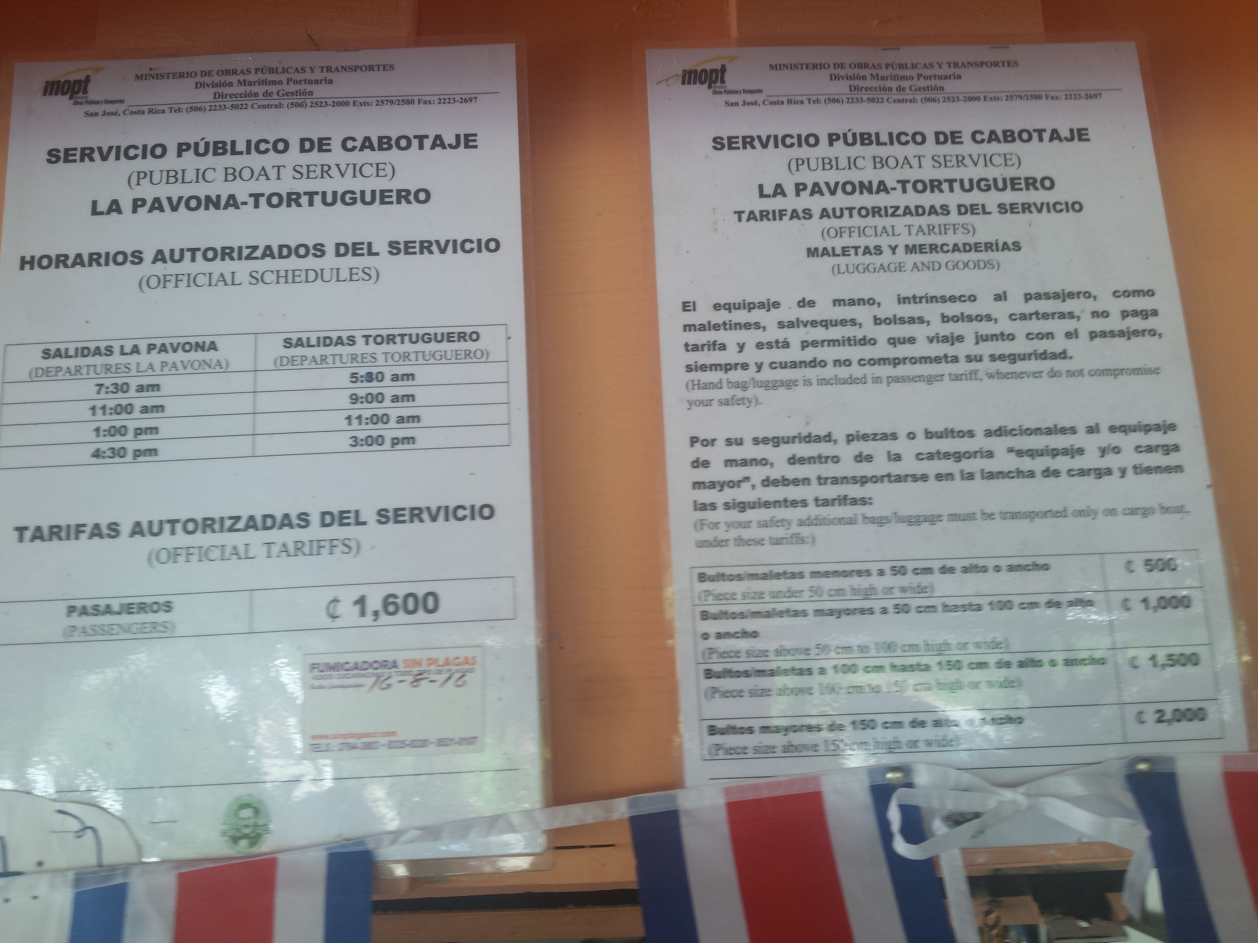 muelle hay un parquing enorme, con capacidad para 200 coches, 10$ la noche; y un restaurante con buena sombra. Acceso al lavabo 500 colones. El parquing está vigilado las 24h, así que dejamos las maletas dentro del coche y nos vamos con las mochilas pequeñas. La barca cuesta 1.600 colones por trayecto, más 500 por la mochilita. El trayecto dura entre 1h30 y 2h dependiendo de la profundidad del río, y de las paradas que haga hasta llegar al muelle de Tortuguero.