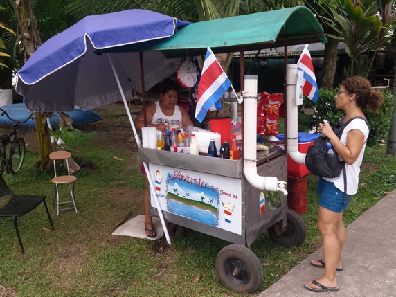 Como no tenemos mucha hambre, para cenar compramos una brocheta de ternera arreglada, o sea, con acompañamiento de ensalada, plátano frito y una salsa, 1.500 colones. De postre, en un pequeño local familiar dirección al parque tomamos un par de pipas frías, 500 colones cada una.